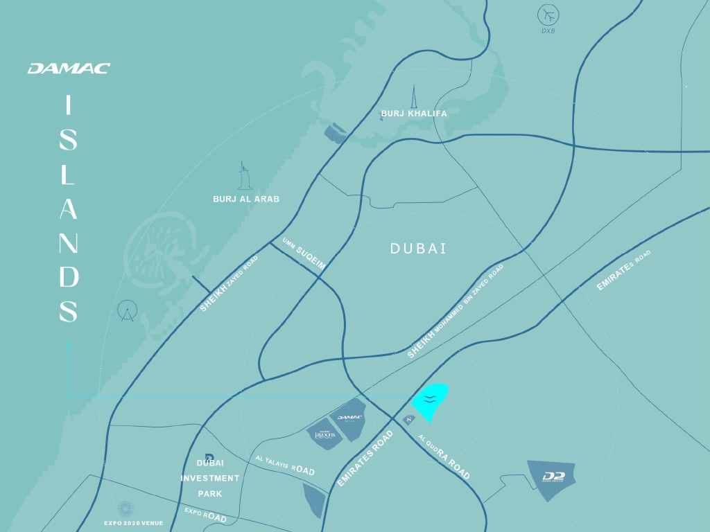 تم اختيار موقع مشروع DAMAC Islands بعناية في أفضل موقع استراتيچي على الجزيرة، حيث أن المشروع هو حلقة الوصل بين دبي وأبو ظبي. فهو على بُعد دقائق معدودة من أكبر مطار في العالم وهو مطار آل مكتوم الدولي، وهو أيضًا قريب من مطار دبي الدولي وبرچ العرب ومُجمع دبي للاستثمار وغيرها من أهم معالم دبي الشهيرة.